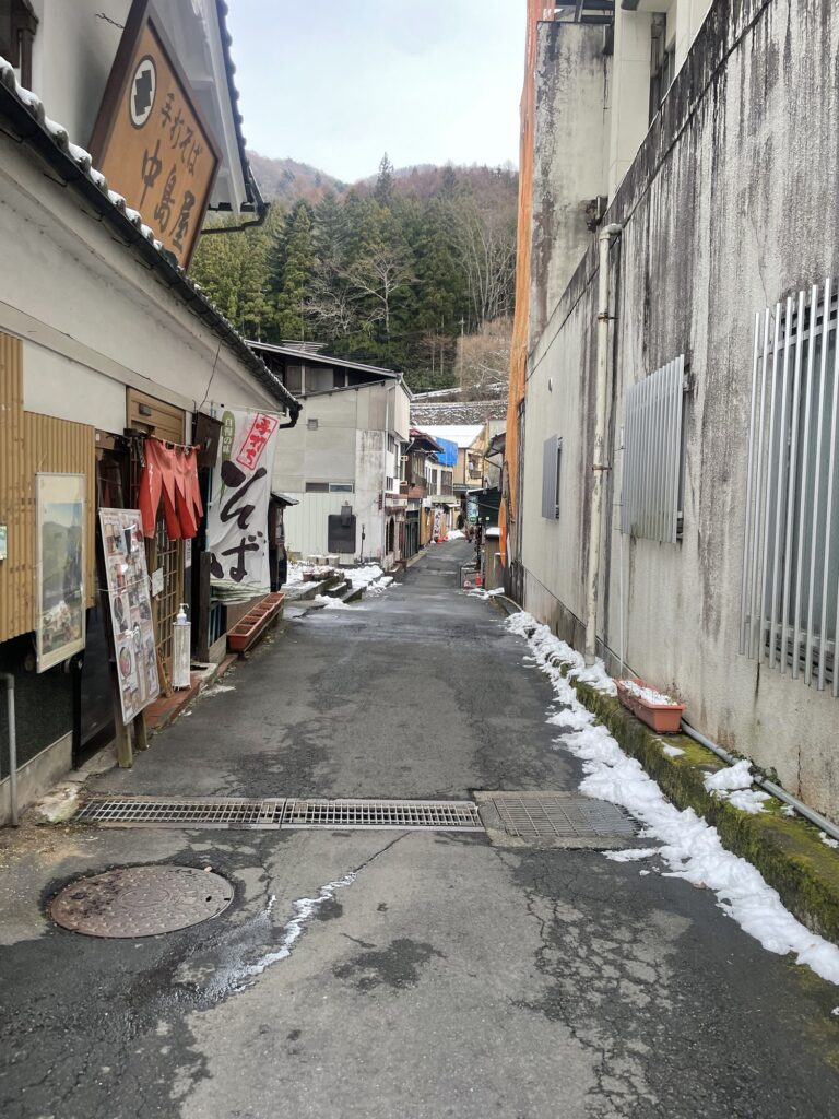 The hot spring town stretches through the mountains, offering a quiet and peaceful atmosphere.